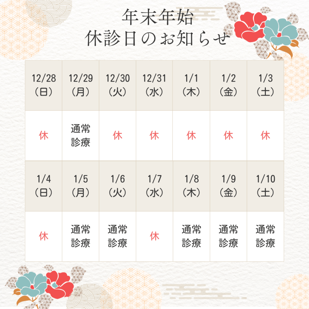 2025年最終の診療日は12月29日となりますのでご注意ください。